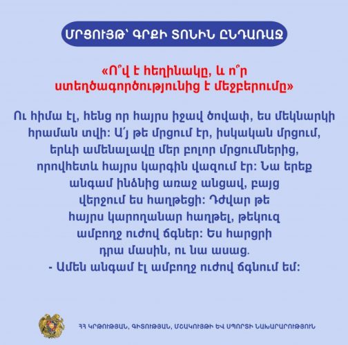 ԿԳՄՍՆ-ն ներկայացրել է Գիրք նվիրելու օրվան նվիրված մրցույթի 7-րդ հրապարակումը, որը նախատեսված է 10-12-րդ դասարանի աշակերտների համար:
